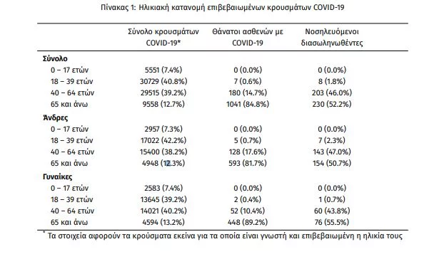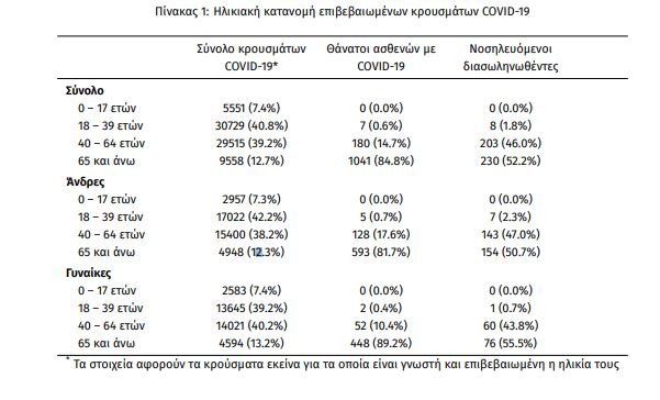 Το μεγαλύτερο ποσοστό (84,8%) αφορά άτομα ηλικίας 65 ετών και άνω, ενώ 180 πολίτες ηλικίας 40-64 ετών έχασαν τη ζωή τους και άλλοι 7 από τις ηλικίες 18-39 ετών.