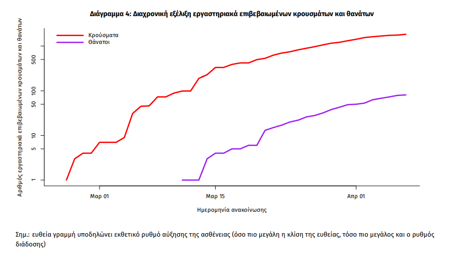 Η διαχρονική εξέλιξη των συνολικών κρουσμάτων και συνολικού αριθμού των θανάτων ασθενών COVID-19 παρουσιάζεται στο ακόλουθο διάγραμμα (σε λογαριθμική κλίμακα):