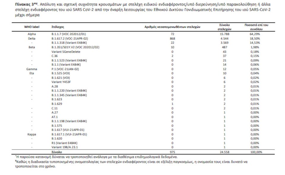 Εκ των 950 δειγμάτων με στελέχη ειδικού ενδιαφέροντος, τα 868 αφορούν στο στέλεχος Delta, 72 αφορούν στο Alpha και 10 αφορούν στο Βeta.