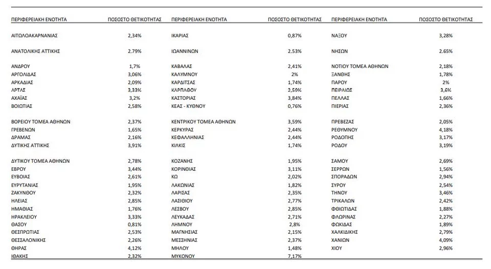Ακολουθεί ο πίνακας με το ποσοστό θετικότητας στο σύνολο των ελέγχων ανά Περιφερειακή Ενότητα με δεδομένα από 17 Ιανουαρίου 2022 έως 23 Ιανουαρίου 2022: