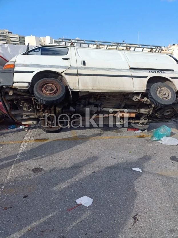 Ο ανεμοστρόβιλος αναποδογύρισε ολόκληρο αυτοκίνητο, τύπου βαν, ενώ προκάλεσε σοβαρές ζημιές σε πάγκους και τέντες, σύμφωνα με το neakriti.gr.