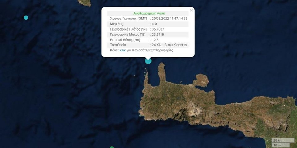 Σημειώνεται, πάντως, ότι σύμφωνα με το Ευρωμεσογειακό Ινστιτούτο, ο σεισμός είχε ένταση 4,1 Ρίχτερ, επίκεντρο 21 χιλιόμετρα βόρεια της Κισσάμου και εστιακό βάθος 5 χιλιόμετρα.