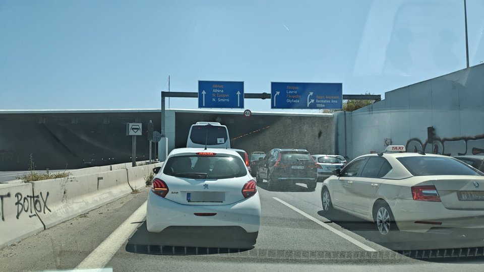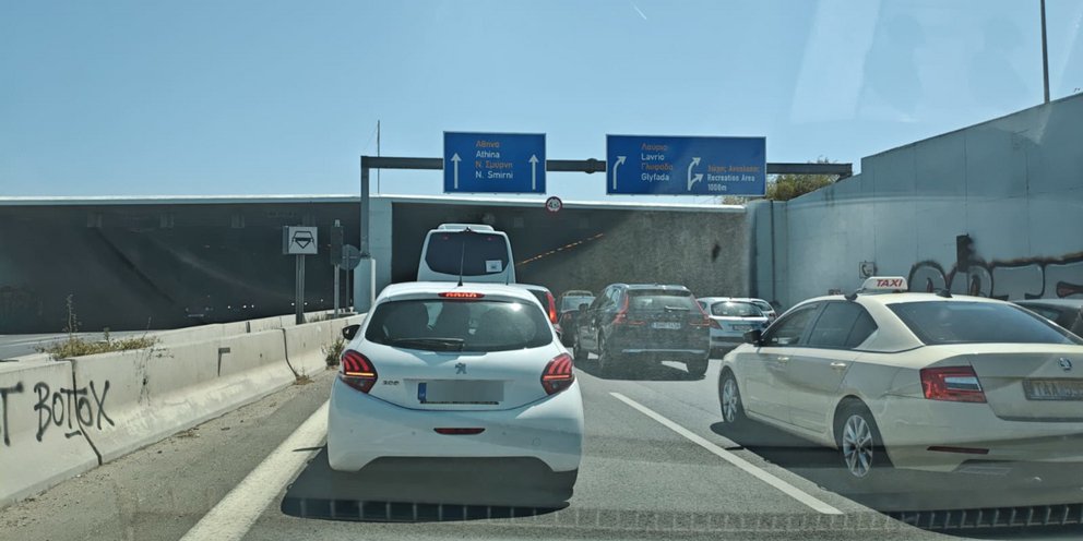 Η κίνηση στην Ποσειδώνος, πριν από τα τούνελ στο ρεύμα προς Αθήνα, είναι στο «κόκκινο» το μεσημέρι της Κυριακής, καθώς είναι σε ισχύ κυκλοφοριακές ρυθμίσεις λόγω αγώνα δρόμου.