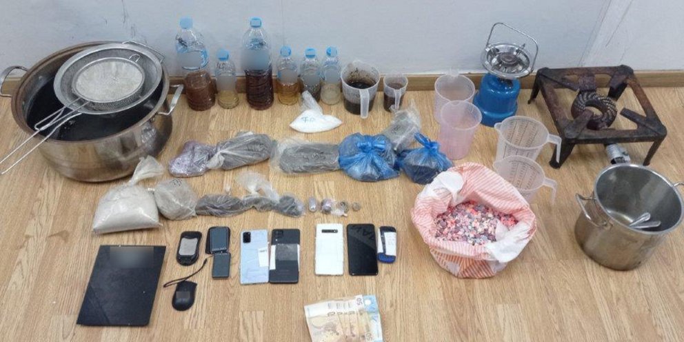 Συνολικά, βρέθηκαν και κατασχέθηκαν, σύμφωνα με την ΕΛΑΣ: Ηρωίνη βάρους 3 κιλών και 763,8 γραμμαρίων, 4.200 δισκία ECSTASY, κρυσταλλική μεθαμφεταμίνη σε υγρή μορφή καθαρού βάρους 2.630 γραμ., κρυσταλλική μεθαμφεταμίνη 70 γραμ., μεθαμφεταμίνη 285 γραμ., το χρηματικό ποσό των 485 ευρώ, 4 ηλεκτρονικές ζυγαριές ακριβείας, 5 συσκευές κινητής τηλεφωνίας, 10 δοχεία με υγρό άγνωστης χημικής σύστασης, εξοπλισμός εργαστηρίου ναρκωτικών και ΙΧ αυτοκίνητο.