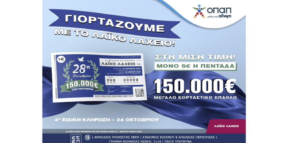 Η 4η ειδική κλήρωση του Λαϊκού Λαχείου για το 2025, θα μεταδοθεί ζωντανά την Παρασκευή 24 Οκτωβρίου στις 19:00, από το κανάλι του ΟΠΑΠ στο YouTube. Εκτός από το μεγάλο έπαθλο των 150.000 ευρώ στην τυχερή πεντάδα, η ειδική κλήρωση για την εθνική επέτειο της 28ης Οκτωβρίου, μοιράζει στους παίκτες και άλλα, μικρότερα έπαθλα.