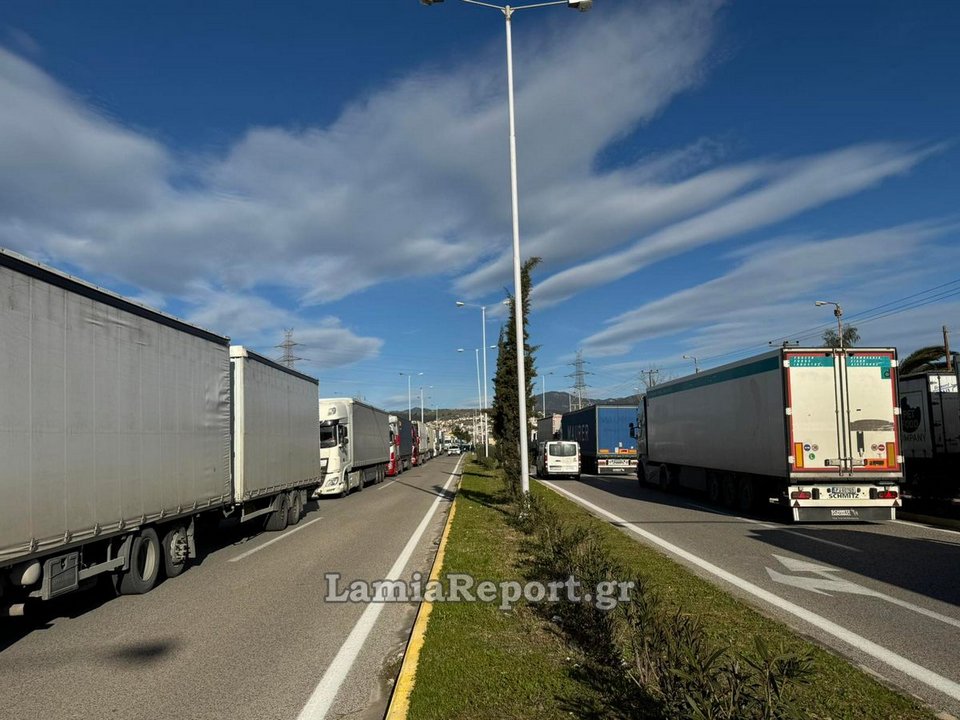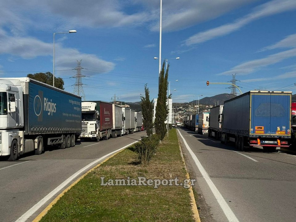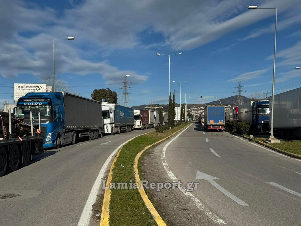 Εκατοντάδες φορτηγά παραμένουν εγκλωβισμένα σε πάρκινγκ εντός και γύρω από τη Λαμία, καθώς δεν μπορούν να περάσουν το μπλόκο του Μπράλου.