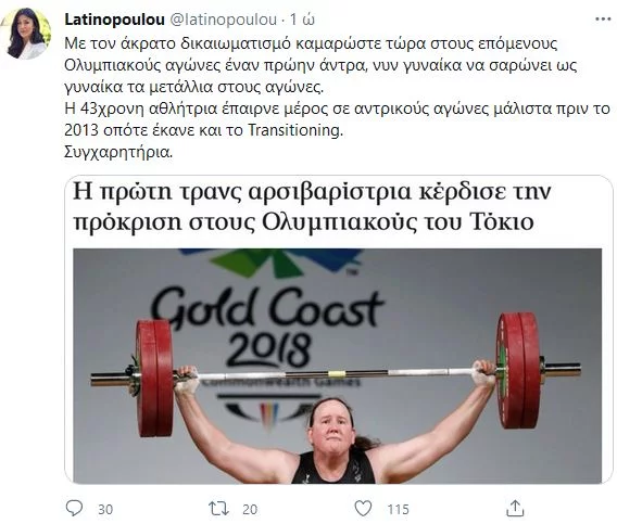 Η Αφροδίτη Λατινοπούλου σχολίασε στο Twitter της το γεγονός πως η πρώτη τρανς αρσιβαρίστρια κέρδισε την πρόκριση για τους Ολυμπιακούς Αγώνες του Τόκιο.