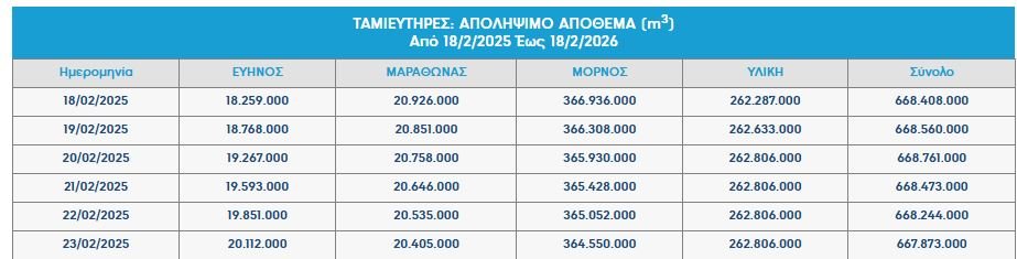 Στα επίπεδα του Φεβρουαρίου του 2025, βρίσκονται πλέον τα αποθέματα νερού στους ταμιευτήρες σε Μόρνο, Ευήνο, Υλίκη και Μαραθώνα.