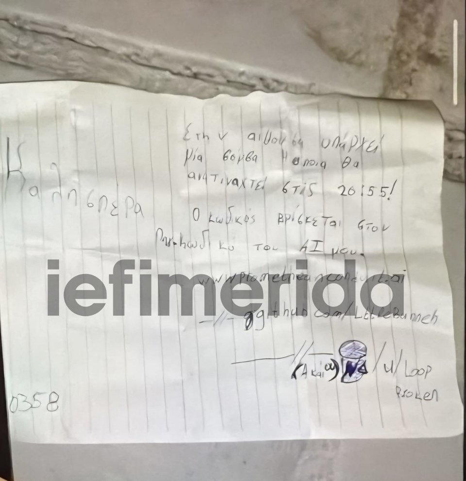 Σύμφωνα με πληροφορίες, το σακίδιο βρέθηκε στον αριθμό 2025, δίπλα σε κολέγιο, και το σημείωμα έγραφε μεταξύ άλλων: «Καλησπέρα, στην αίθουσα υπάρχει μία βόμβα η οποία θα ανατιναχτεί στις 20:55!».