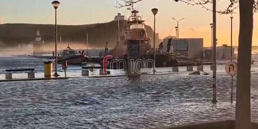 Το νερό καλύπτει τον δρόμο κα φτάνει έως το Δημαρχείο, ενώ το οδόστρωμα και το πάρκινγκ του λιμανιού πλημμύρισαν.