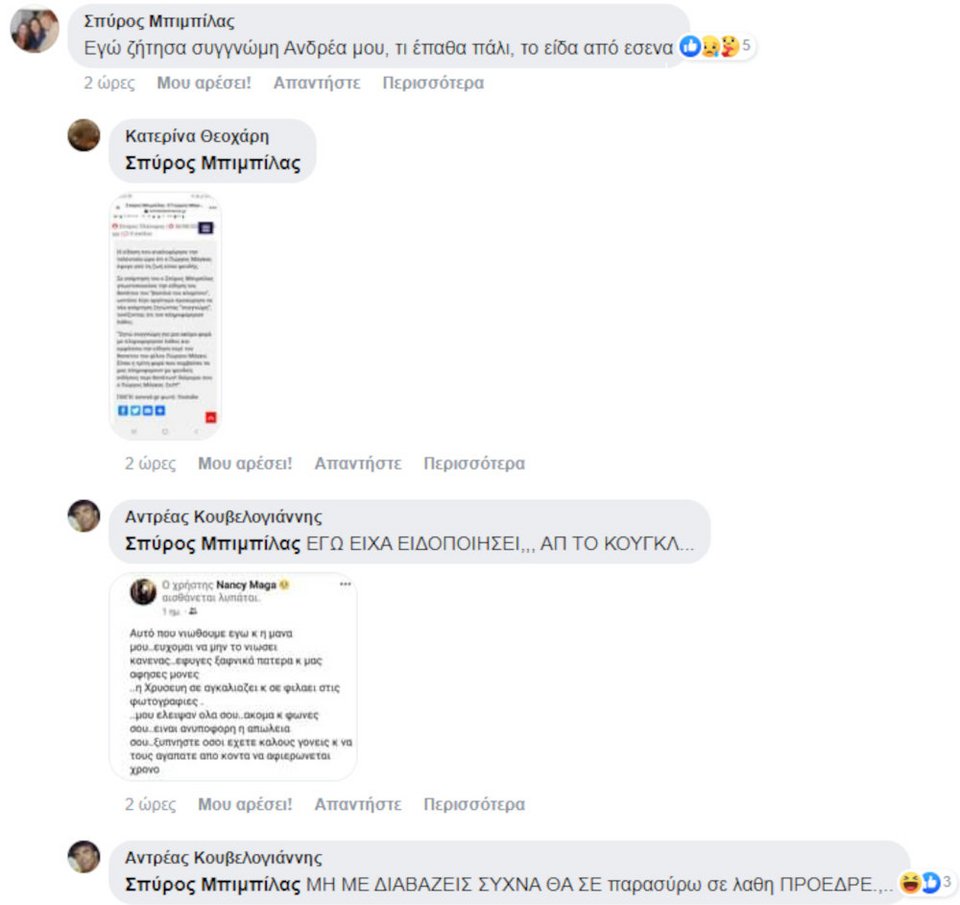 Κάπου εδώ, ο Σπύρος Μπιμπίλας σβήνει την αρχική ανάρτηση και ζητάει συγγνώμη για την παραπληροφόρηση... Γράφει δε δημόσια ότι «παρασύρθηκε» από τον Ανδρέα Κουβελογιάννη, ο οποίος του απαντά να μην τον ακούει και τα ρίχνει σε κάποιο... «coogle».