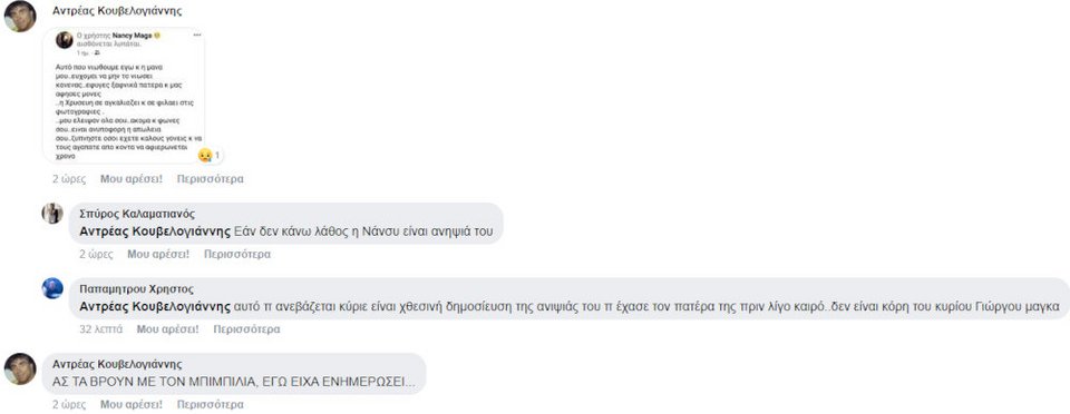 «Παιδιά καλησπέρα, θα ήθελα να ενημερώσω τον κόσμο που στέλνει μηνύματα και συλλυπητήρια για τον πατέρα μου ότι δεν πέθανε. Είναι ψέματα και όλα αυτά ξεκίνησαν από τον ηθοποιό Μπιμπίλα που έκανε ανάρτηση. Θα έχει τις συνέπειες με τα ψέματα που διαδίδει. Παραπληροφόρηση. Ο Γιώργος Μάγκας ζει και βασιλεύει».
