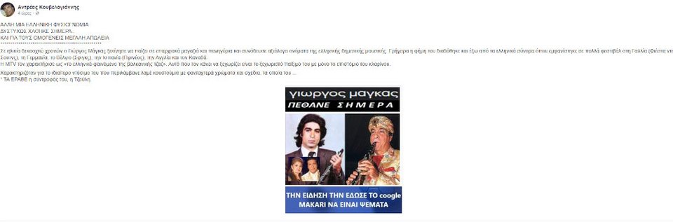 «Γιώργος Μάγκας, πέθανε σήμερα, την είδηση την έδωσε το coogle, μακάρι να είναι ψέματα»!