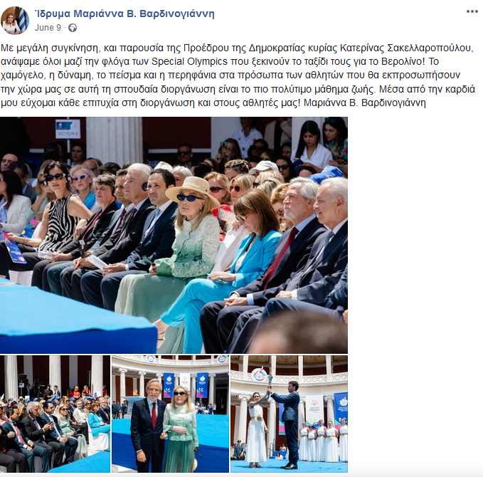 «Με μεγάλη συγκίνηση, και παρουσία της Προέδρου της Δημοκρατίας κυρίας Κατερίνας Σακελλαροπούλου, ανάψαμε όλοι μαζί τη φλόγα των Special Olympics που ξεκινούν το ταξίδι τους για το Βερολίνο! Το χαμόγελο, η δύναμη, το πείσμα και η περηφάνια στα πρόσωπα των αθλητών που θα εκπροσωπήσουν τη χώρα μας σε αυτή τη σπουδαία διοργάνωση είναι το πιο πολύτιμο μάθημα ζωής. Μέσα από την καρδιά μου εύχομαι κάθε επιτυχία στη διοργάνωση και στους αθλητές μας!» έγραψε τότε η Μαριάννα Β. Βαρδινογιάννη.