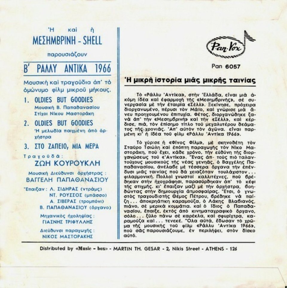 Σημαντικό μουσικό παραλειπόμενο: Την «ορχήστρα» του φιλμ Ράλλυ Αντίκα 1966 αποτελούσαν ο Βαγγέλης Παπαθανασίου (Hammond,) ο Ντέμης Ρούσσος (μπάσο) και ο Λουκάς Σιδεράς (ντραμς.) Ήταν, δηλαδή, ανεπίσημα η πρώτη εμφάνιση των Aphrodite’s Child.