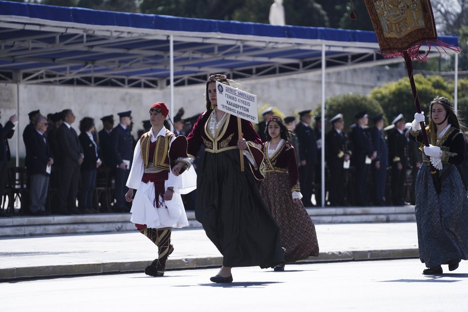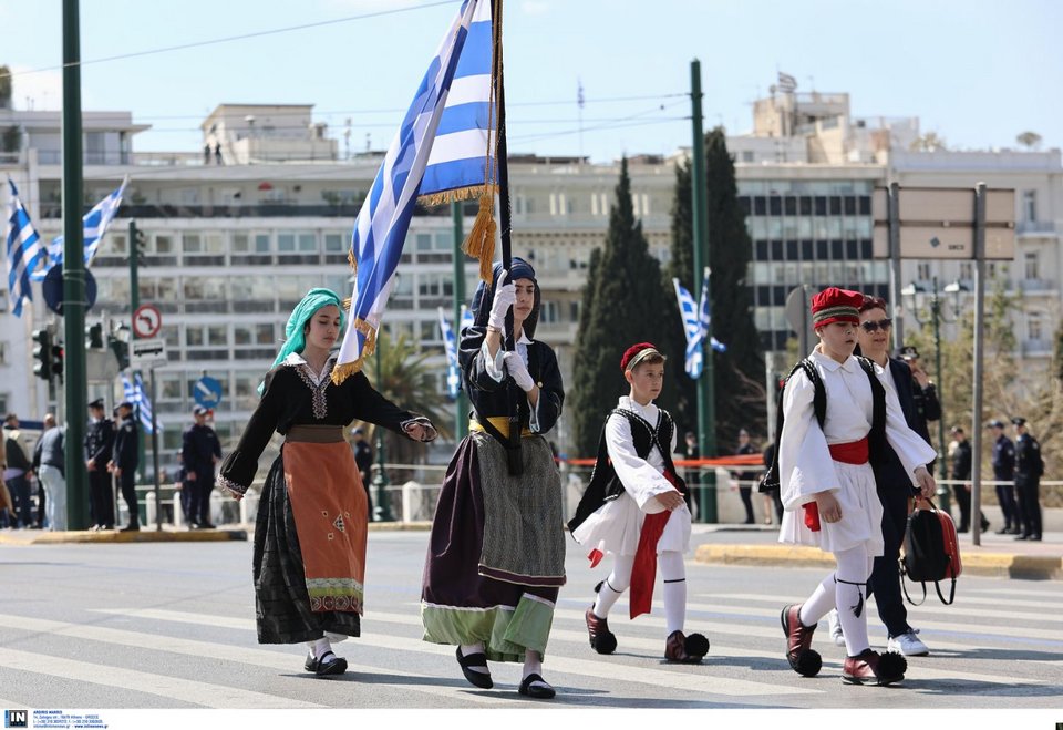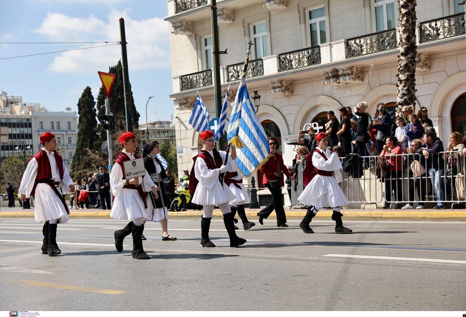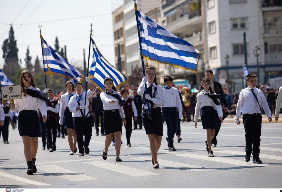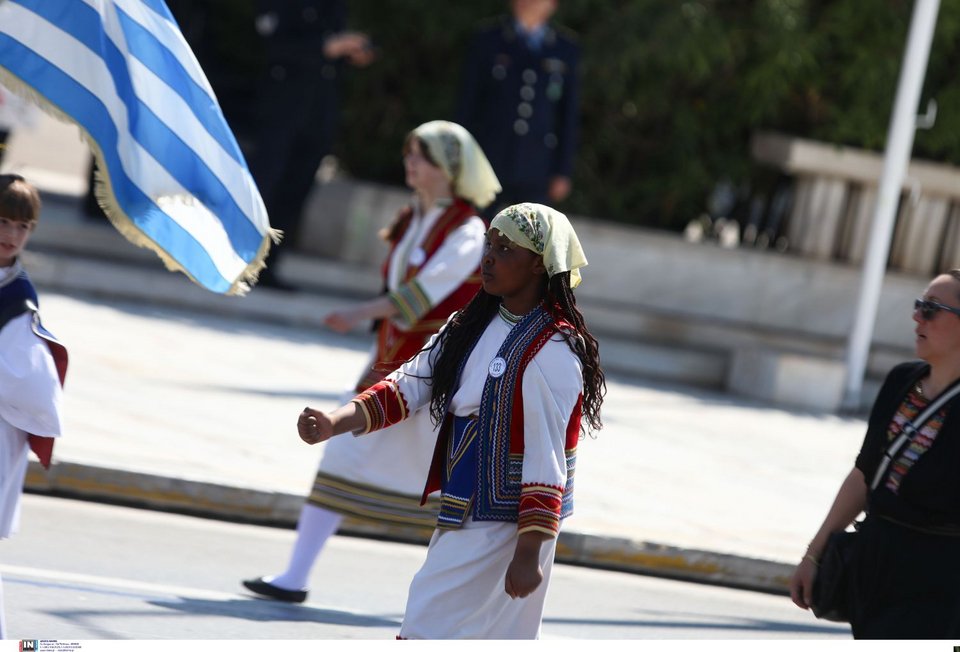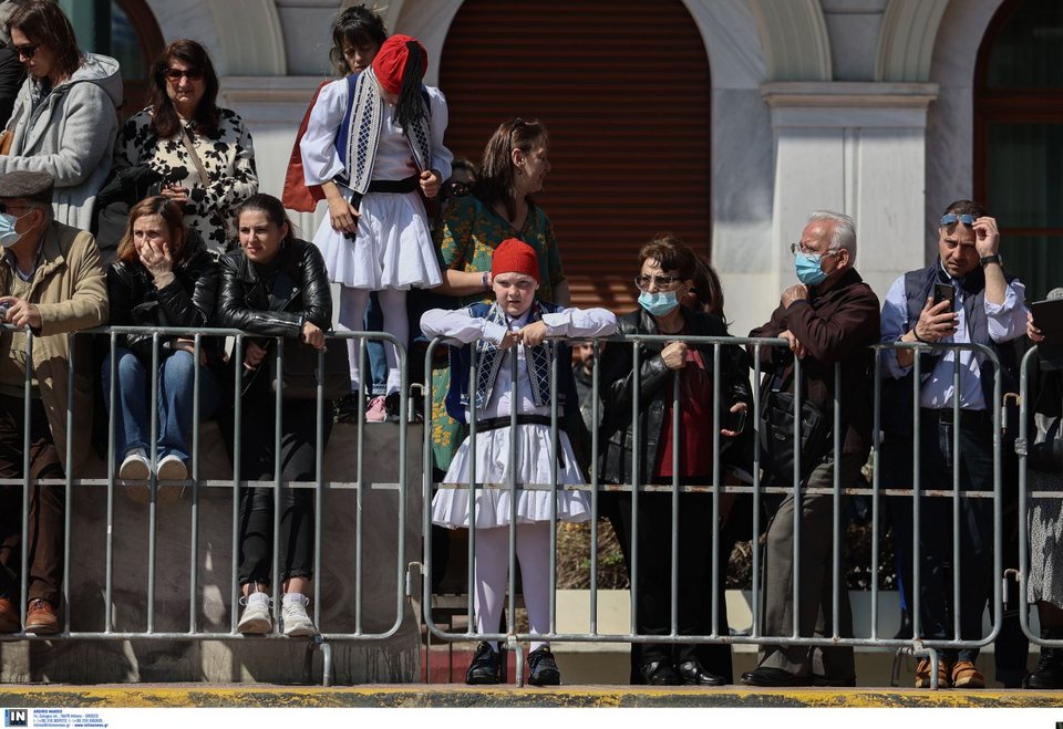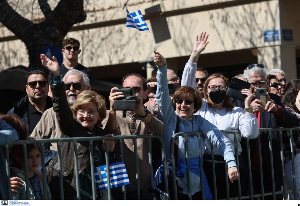 Ο καιρός ήταν σύμμαχος στη φετινή παρέλαση, με τους μαθητές να παρελαύνουν με τις στολές του σχολείου, τις καθιερωμένες μπλε-άσπρες φορεσιές, ή παραδοσιακές στολές για την 25η Μαρτίου.