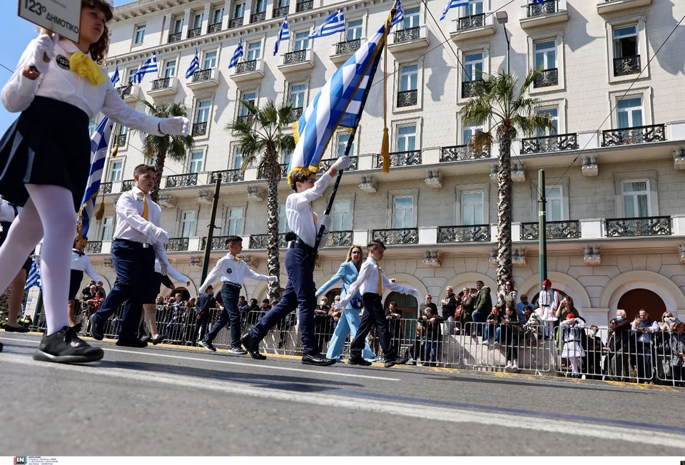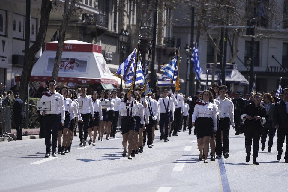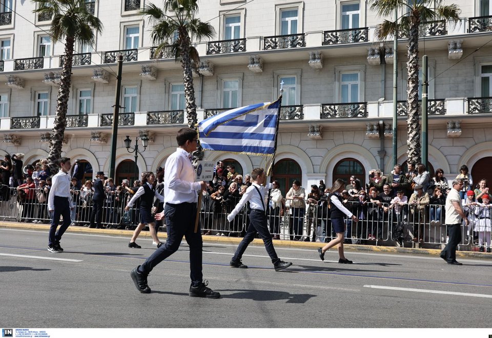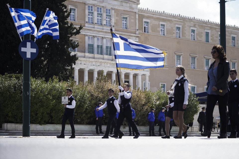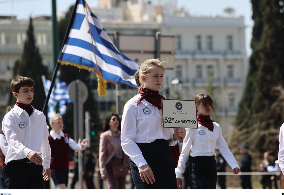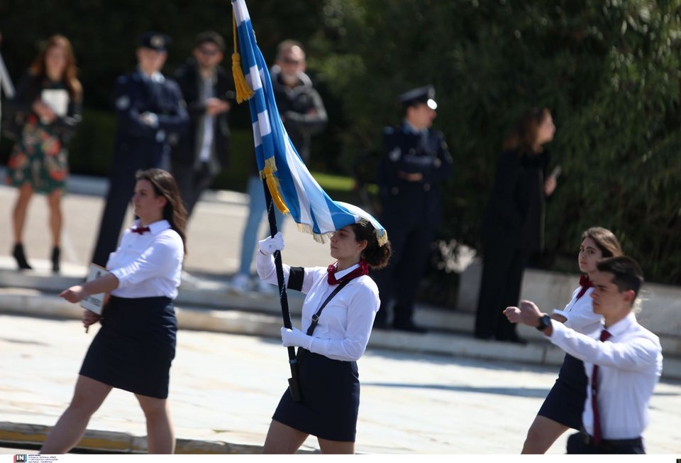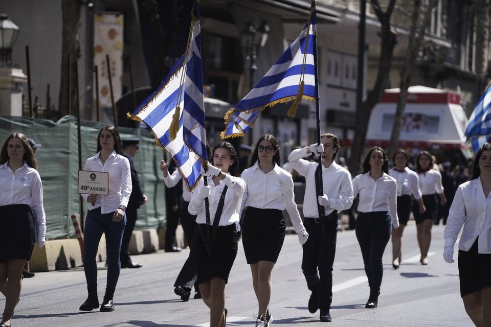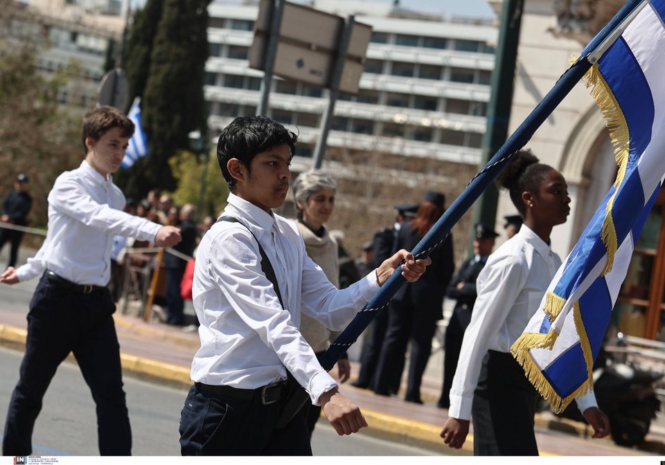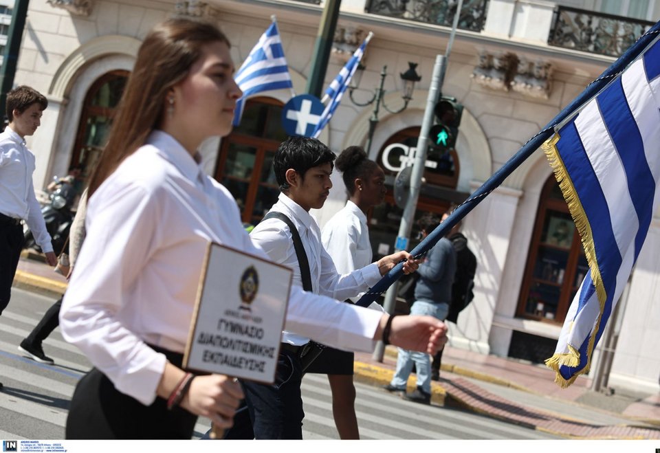 Μαθητές, δάσκαλοι και καθηγητές έδωσαν το «παρών» στο Σύνταγμα, στο κέντρο της Αθήνας, στη μαθητική παρέλαση για την 25η Μαρτίου, την πρώτη χωρίς κανένα περιοριστικό μέτρο.