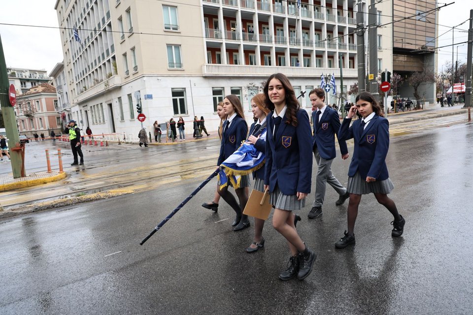Σε εξέλιξη βρίσκεται αυτή την ώρα στο κέντρο της Αθήνας η μαθητική παρέλαση της 25ης Μαρτίου με πλήθος κόσμου, παρόλο το ψιλόβροχο που πέφτει από νωρίς.