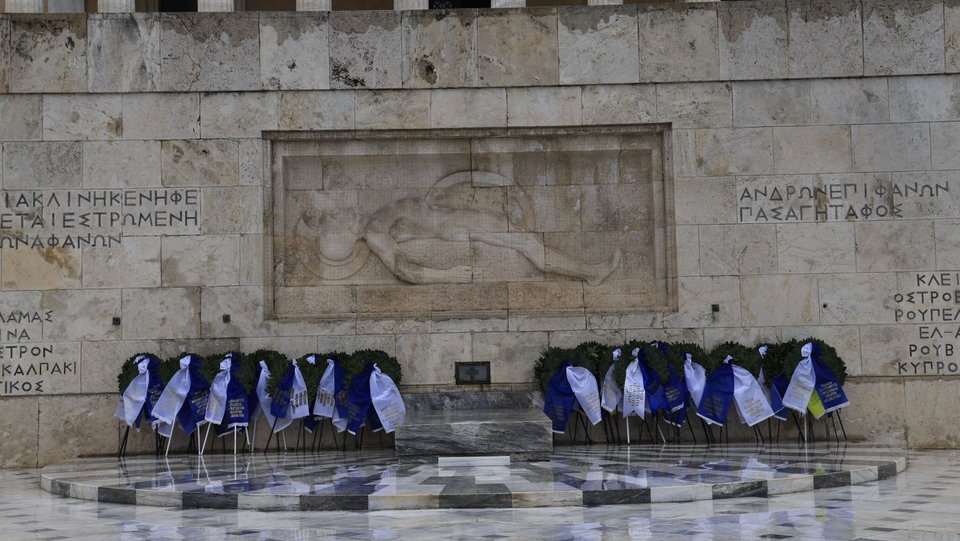 Νωρίτερα, της παρέλασης προηγήθηκε κατάθεση στεφάνων στο μνημείο του Αγνώστου Στρατιώτη, μεταξύ άλλων από την Υπουργό Παιδείας, Θρησκευμάτων και Αθλητισμού, Σοφία Ζαχαράκη, την πρόεδρο του κόμματος «Πλεύσης Ελευθερίας», Ζωή Κωνσταντοπούλου και τον δήμαρχο Αθηναίων, Χάρη Δούκα, καθώς επίσης και η ανάκρουση του εθνικού ύμνου.