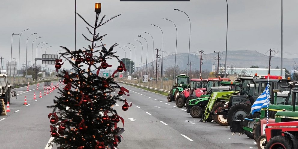 Ανάμεσα στα τρακτέρ που έχουν παραταχθεί και στις σκηνές όπου διαμένουν οι αγρότες τις νύχτες, ξεχωρίζει ένα στολισμένο χριστουγεννιάτικο δέντρο.