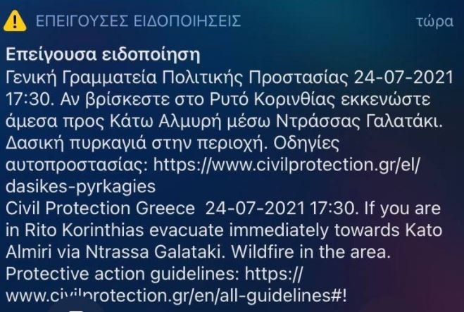 Όπως ανέφερε νωρίτερα το korinthostv, η φωτιά έκαιγε κοντά σε κατοικίες, ενώ οι πύρινες φλόγες έφτασαν κοντά στο γήπεδο Γαλατακίου. Σύμφωνα με πληροφορίες, εστάλη μήνυμα του 112 της Πολιτικής Προστασίας, καλώντας τους πολίτες να εκκενώσουν τον οικισμό Ρυτό και να κατευθυνθούν προς την Αλμυρή -δηλαδή προς τη θάλασσα: