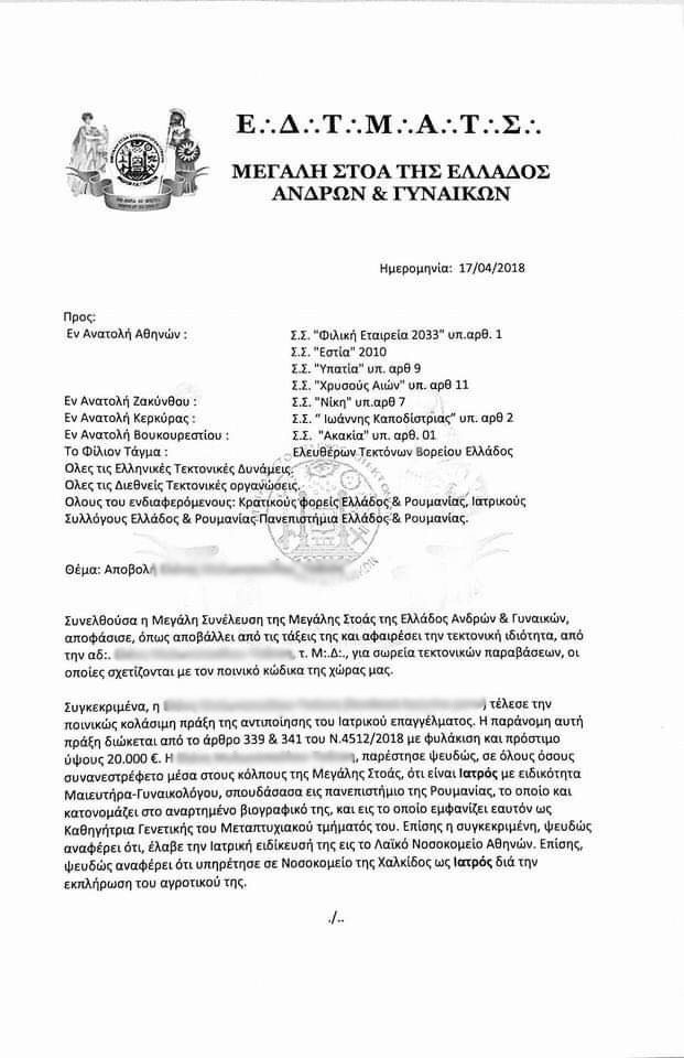 Οπως επισημαίνεται από την αδελφότητα, η ψυχολόγος της άτυχης 20χρονης «παρέστησε ψευδώς σε όλους όσους συναναστρεφόταν μέσα στους κόλπους της Μεγάλης Στοάς ότι είναι ιατρός με ειδικότητα μαιευτήρα-γυναικολόγου, σπουδάσασα σε Πανεπιστήμιο της Ρουμανίας, το οποίο και κατονομάζει στο αναρτημένο βιογραφικό της και εις το οποίο εμφανίζει εαυτόν ως καθηγήτρια γενετικής του μεταπτυχιακού τμήματός τους. Επίσης, η συγκεκριμένη ψευδώς αναφέρει ότι έλαβε την ιατρική ειδίκευσή της εις το Λαϊκό Νοσοκομείο Αθηνών. Επίσης ψευδώς αναφέρει ότι υπηρέτησε σε νοσοκομείο της Χαλκίδος για την εκπλήρωση του αγροτικού της».