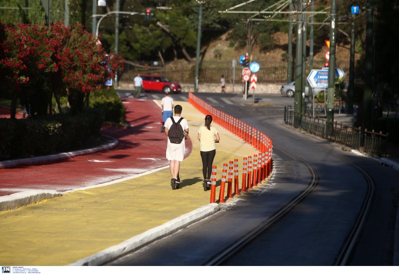 Δίπλα σε αυτόν, εκεί που περνούν οι γραμμές του τραμ, δημιουργήθηκε μια προσωρινή διαδρομή για ποδήλατο, σε κίτρινο χρώμα με αντανακλαστικές και αντιολισθητικές βαφές. Μια διαδρομή που φτιάχτηκε από τον Δήμο Αθηναίων αξιοποιώντας το γεγονός ότι το τραμ έχει διακόψει στο σημείο αυτό τα δρομολόγια του, για να διευκολύνει τους ποδηλάτες να φτάσουν ως τον υπερσύγχρονο ποδηλατόδρομο που δημιουργείται στην Πανεπιστημίου.