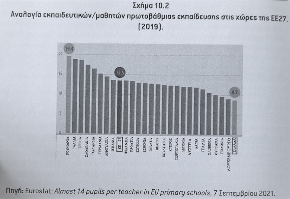 Τις περισσότερες φορές, τα γεγονότα έχουν και μία δεύτερη ανάγνωση, η οποία συνήθως είναι και η πλέον ρεαλιστική. Στον πίνακα κατάταξης των χωρών της ΕΕ με τις αναλογίες δασκάλων - μαθητών (με στοιχεία έως και του Σεπτεμβρίου του 2021), η Ελλάδα καταχωρείται ως έχουσα 8,7 μαθητές να αναλογούν σε έναν δάσκαλο, σε αντίθεση με τη Ρουμανία, όπου οι μαθητές που αναλογούν σε έναν δάσκαλο είναι 19,4! Αν συνυπολογίσει κανείς ότι ο μέσος όρος της συγκεκριμένης αναλογίας στις χώρες της ΕΕ είναι ένας προς 13,5, θα έλεγε πως η Ελλάδα είναι μία χώρα με -αν μη τι άλλο- εντυπωσιακή επάρκεια δασκάλων, όπου τα σχολεία διαθέτουν μικρές, ευέλικτες τάξεις, γεγονός που προφανώς επιτρέπει στους εκπαιδευτικούς να σκύψουν πάνω από κάθε παιδί και να ανασύρουν τα ταλέντα και τις κλίσεις του. Κι όμως, σε αυτόν τον τομέα, η Ελλάδα είναι καταχωρημένη τελευταία στον ζοφερό πίνακα των 27 χωρών της ευρωζώνης, διότι η αναλογία της δεν αποτυπώνει την πληθώρα του εκπαιδευτικού προσωπικού της, αλλά τη μείωση των μαθητών της την τελευταία 12ετία!