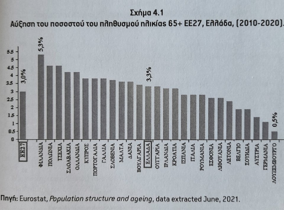 Ευρύ κεφάλαιο της έκδοσης είναι αφιερωμένο στους ηλικιωμένους της Ελλάδας, των οποίων η ποιότητα ζωής -τα χρόνια των μνημονίων- συρρικνώθηκε σημαντικά με την πρωτοφανή για τα ευρωπαϊκά χρονικά μείωση των συντάξεών τους και την έτσι κι αλλιώς ελλειμματική υποδομή σε υγεία και περίθαλψη, που επιβαρύνθηκε τα χρόνια της πανδημίας. Ο δραματικός συνδυασμός μίας χώρας της οποίας ο πληθυσμός δεν αναπληρώνεται και άρα οι παραγωγικές ηλικίες διαρκώς συρρικνώνονται, πολιτικών που δεν θέτουν σε ουσιαστική προτεραιότητα τον ευαίσθητο τομέα της υγείας και ασφαλιστικής και νοσοκομειακής κάλυψης σε διαρκή ασφυξία, διαγράφει ζοφερά σενάρια…