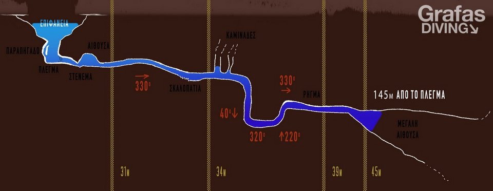 - Από την είσοδο του σπηλαίου ταξίδεψαν στις 330 μοίρες, έπειτα από 90 μέτρα περίπου η πυξίδα έδειξε 40 μοίρες και το βάθος προοδευτικά αυξανόταν κάτι που θα πρέπει να συνυπολογίσει ο δύτης όσον αφορά την επιστροφή του καθώς η εισροή είναι συνεχής και έντονη.