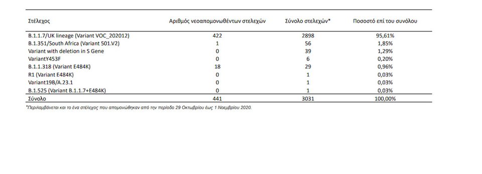 Σύμφωνα με την ανακοίνωση, από τον έλεγχο των 475 δειγμάτων, αναδείχθηκαν συνολικά 423 δείγματα με στελέχη μεταλλάξεων ειδικού ενδιαφέροντος (Variants Of Concern - VOC) και 18 δείγματα με στελέχη υπό διερεύνηση (Variants Under Investigation – VUI). Από τα 423 δείγματα με στελέχη VOC, τα 422 βρέθηκαν με τη μετάλλαξη Β.1.1.7/UK lineage (Variant VOC_202012) και ένα δείγμα με τη μετάλλαξη Lineage B.1.351/South Africa (Variant 501.V2), ενώ και τα 18 δείγματα με στελέχη VUI αφορούσαν το στέλεχος B.1.1.318 (Variant_E484K) (Πίνακας 3).
