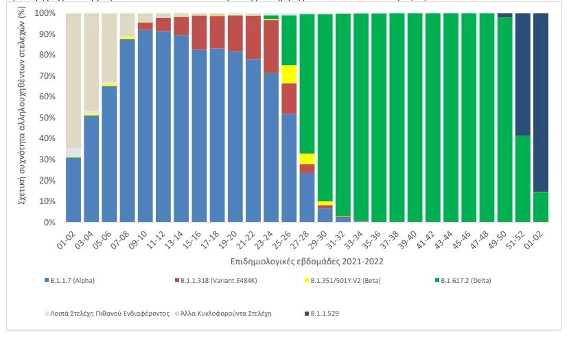Η διαχρονική εξέλιξη της σχετικής συχνότητας των αλληλουχηθέντων δειγμάτων από τυχαία δειγματοληψία ανά είδος στελεχών μέχρι και την εβδομάδα 2 του 2022 απεικονίζεται στο ακόλουθο διάγραμμα: