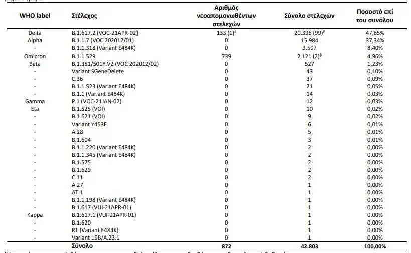 Όπως σημειώνεται, συνολικά, έχουν εντοπιστεί 2.121 κρούσματα με τη μετάλλαξη Όμικρον. Εκ των 872 δειγμάτων με στελέχη ειδικού ενδιαφέροντος, τα 739 αφορούν στο στέλεχος Omicron και τα 133 αφορούν στο Delta, όπως φαίνεται στον ακόλουθο πίνακα: