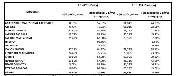 Μεταξύ των 225 δειγμάτων που έχουν ληφθεί ή επιλεγεί στοχευμένα κατά τη διάρκεια του διμήνου πριν από τις 16 Ιανουαρίου 2022, 64% αφορούν το στέλεχος Omicron και 36% το στέλεχος Delta.
