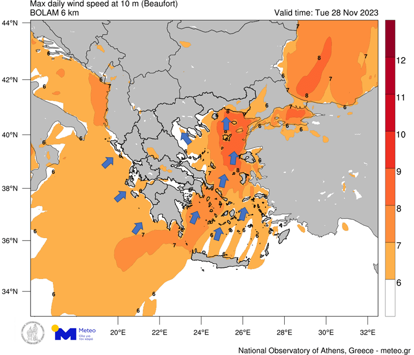 Παράλληλα, την Τρίτη 28/11 αναμένεται σημαντική ενίσχυση των νότιων-νοτιοδυτικών ανέμων με εντάσεις έως 8 μποφόρ στο Αιγαίο. Σταδιακή εξασθένηση των ανέμων αναμένεται από τις πρώτες πρωινές ώρες της Τετάρτης 29/11/2023.
