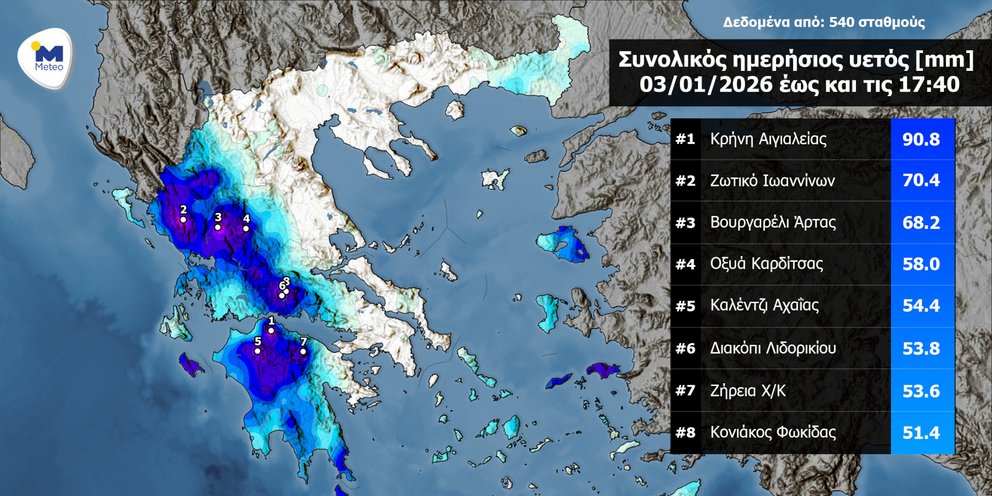 Στον παρακάτω χάρτη παρουσιάζεται η κατανομή των βροχών έως τις 17:40 του Σαββάτου 03/01, ενώ στον πίνακα παρουσιάζονται τα οκτώ μεγαλύτερα ύψη βροχής για το ίδιο χρονικό διάστημα.