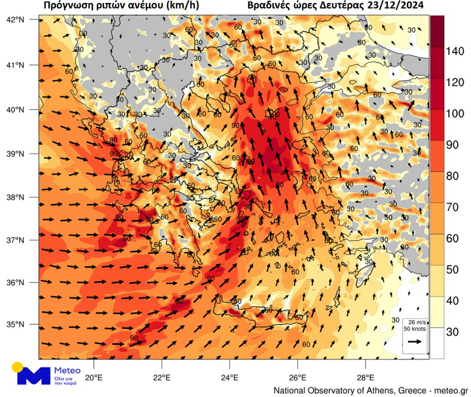 Παράλληλα, από το απόγευμα της Δευτέρας 23/12, οι άνεμοι σε ολόκληρη τη χώρα θα παρουσιάσουν σημαντική ενίσχυση με τις εντάσεις του να φτάνουν τα 7 μποφόρ και τοπικά στο Αιγαίο τα 8 μποφόρ. Στο χάρτη που ακολουθεί παρουσιάζονται οι εκτιμώμενες μέγιστες ριπές του ανέμου τις βραδινές ώρες της Δευτέρας 23/12. Όπως φαίνεται, άνεμοι δυτικών διευθύνσεων με ριπές 90-100 km/h θα πνέουν στη Δυτική Ελλάδα και άνεμοι νοτίων διευθύνσεων με ριπές 90-100 km/h στο Αιγαίο.