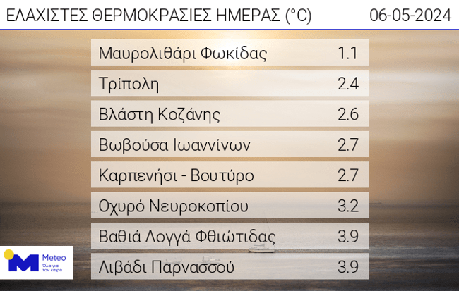 Η ελάχιστη θερμοκρασία σημειώθηκε στο μετεωρολογικό σταθμό στο Μαυρολιθάρι Φωκίδας και ήταν ίση με 1,1 βαθμούς Κελσίου.