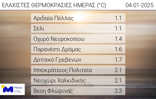 Σύμφωνα με το δίκτυο αυτόματων μετεωρολογικών σταθμών του meteo.gr / Εθνικού Αστεροσκοπείου Αθηνών, η ελάχιστη θερμοκρασία (1,1°C) σημειώθηκε στην Αριδαία Πέλλας και στο Σέλι.