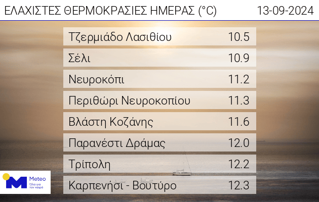 Σύμφωνα με το δίκτυο αυτόματων μετεωρολογικών σταθμών του meteo.gr / Εθνικού Αστεροσκοπείου Αθηνών, οι ελάχιστες θερμοκρασίες που καταγράφηκαν τις πρωινές ώρες της Παρασκευής 13/09 πλησίασαν τους 10 ˚C.