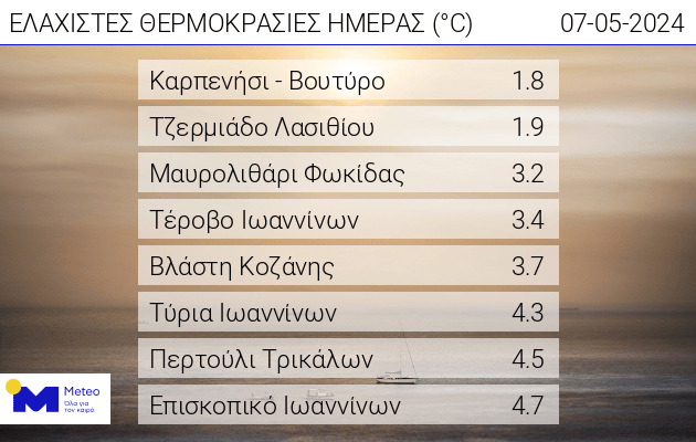 Στον παρακάτω πίνακα παρουσιάζονται οι 8 σταθμοί του δικτύου αυτόματων μετεωρολογικών σταθμών του meteo.gr / Εθνικού Αστεροσκοπείου Αθηνών που κατέγραψαν τις χαμηλότερες θερμοκρασίες το πρωί της Τρίτης 07/05.