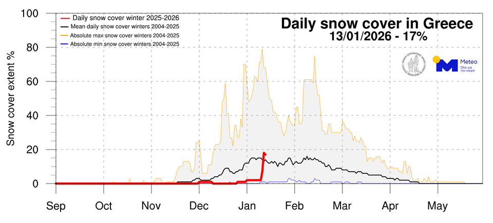 Η παρακολούθηση της χιονοκάλυψης από τον Σεπτέμβριο 2025 δείχνει ότι έως τα τέλη Δεκεμβρίου η παρουσία χιονιού στη χώρα ήταν αρκετά περιορισμένη, όπως συχνά συμβαίνει την τελευταία δεκαετία.