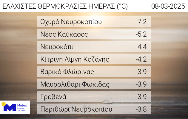 Στον παρακάτω πίνακα παρουσιάζονται οι οκτώ χαμηλότερες ελάχιστες θερμοκρασίες το πρωί του Σαββάτου 08/03 σύμφωνα με το δίκτυο αυτόματων μετεωρολογικών σταθμών του Εθνικού Αστεροσκοπείου Αθηνών / meteo.gr.