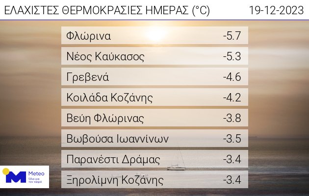 Οι ελάχιστες θερμοκρασίες σύμφωνα με το meteo