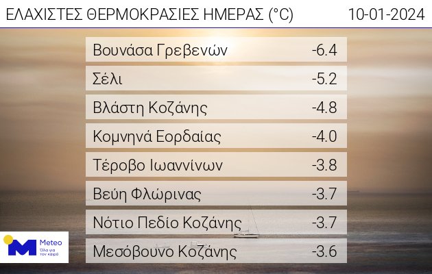 Η χαμηλότερη θερμοκρασία καταγράφηκε στη Βουνάσα Γρεβενών (-6,4 βαθμοί Κελσίου). Ακολουθούν το Σέλι (-5,2), η Βλάστη Κοζάνης (-4,8), τα Κομνηνά Εορδαία (-4), το Τέροβο Ιωαννίνων (-3,8), η Βεύη Φλώρινας (-3,7), το Νότιο Πεδίο Κοζάνης (-3,7) και το Μεσόβουνο Κοζάνης (-3,6).