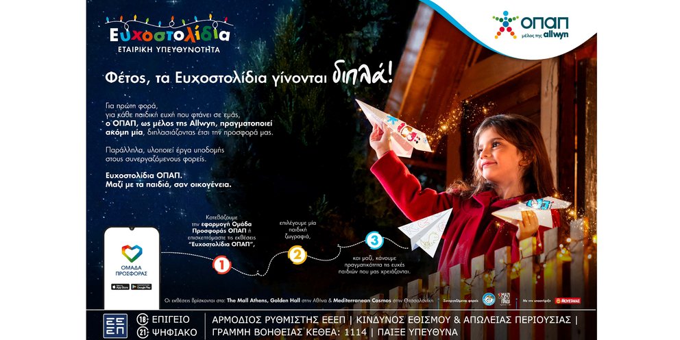 Για πρώτη φορά, ο ΟΠΑΠ – μέλος της Allwyn – ενισχύει ακόμη περισσότερο τη δράση προσφοράς. Για κάθε ευχή που πραγματοποιείται, ο ΟΠΑΠ υλοποιεί μία ακόμη, διπλασιάζοντας με αυτόν τον τρόπο τον αντίκτυπο και την αξία της πρωτοβουλίας.