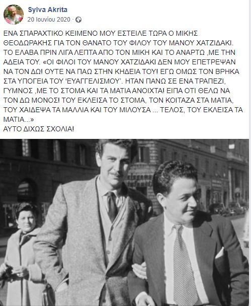 Το κείμενο είχε στείλει ο Μίκης Θεοδωράκης στη Σύλβια Ακρίτα και εκείνη το είχε δημοσιεύσει στα σόσιαλ μίντια. Σε αυτό ο Μίκης Θεοδωράκης μιλάει για την επίσκεψή του στα υπόγεια του «Ευαγγελισμού», όταν ο Μάνος Χατζιδάκις πέθανε. Όπως λέει, οι φίλοι του Μάνου δεν τον άφησαν να τον δει, αλλά αυτός, παρ' όλα αυτά, πήγε, τον βρήκε, «του μίλησε» και, όπως λέει, του έκλεισε τα μάτια.
