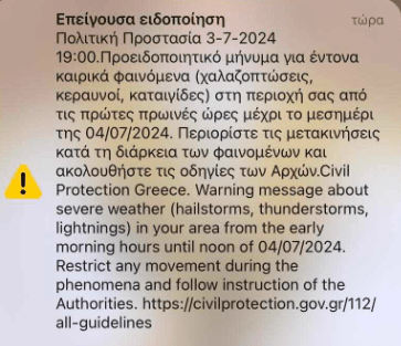 «Προειδοποιητικό μήνυμα για έντονα καιρικά φαινόμενα (χαλαζοπτώσεις, καταιγίδες, κεραυνοί) στην περιοχή σας από τις πρώτες πρωινές ώρες μέχρι το μεσημέρι της 4/7/2024. Περιορίστε τις μετακινήσεις κατά τη διάρκεια των φαινομένων και ακολουθήστε τις οδηγίες των αρχών» τονίζει το 112.