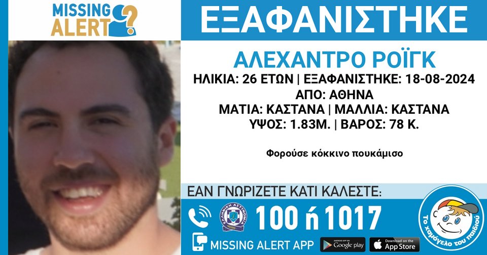 Συναγερμός έχει σημάνει στην ΕΛ.ΑΣ για την εξαφάνιση το πρωί της Κυριακής (18/8) του 26χρονου Αλεχάντρο Ρόιγκ από το κέντρο της Αθήνας.