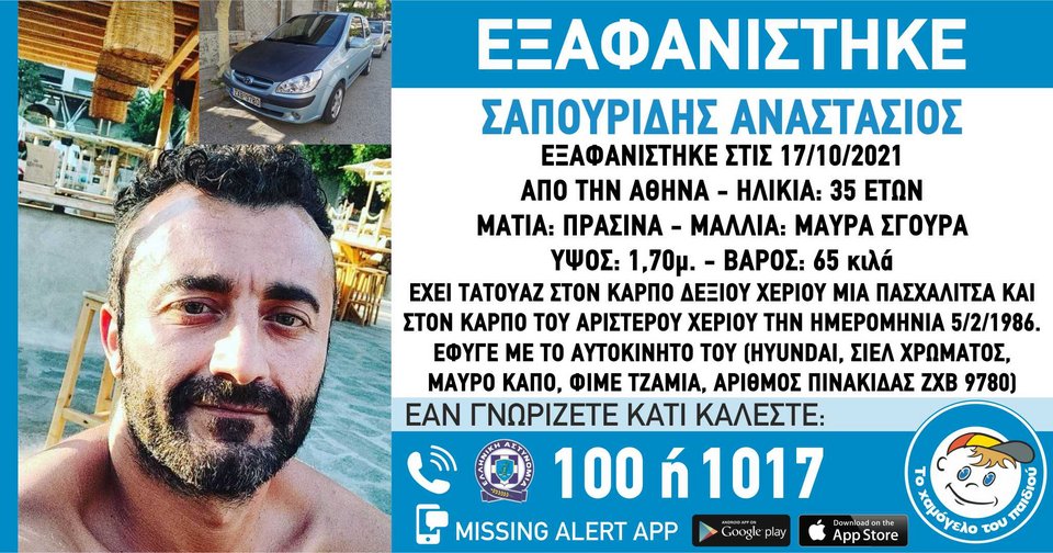 Συναγερμός έχει σημάνει για την εξαφάνιση του Αναστάσιου Σαπουρίδη, 35 ετών, από την περιοχή της Αθήνας, από τις 17/11.